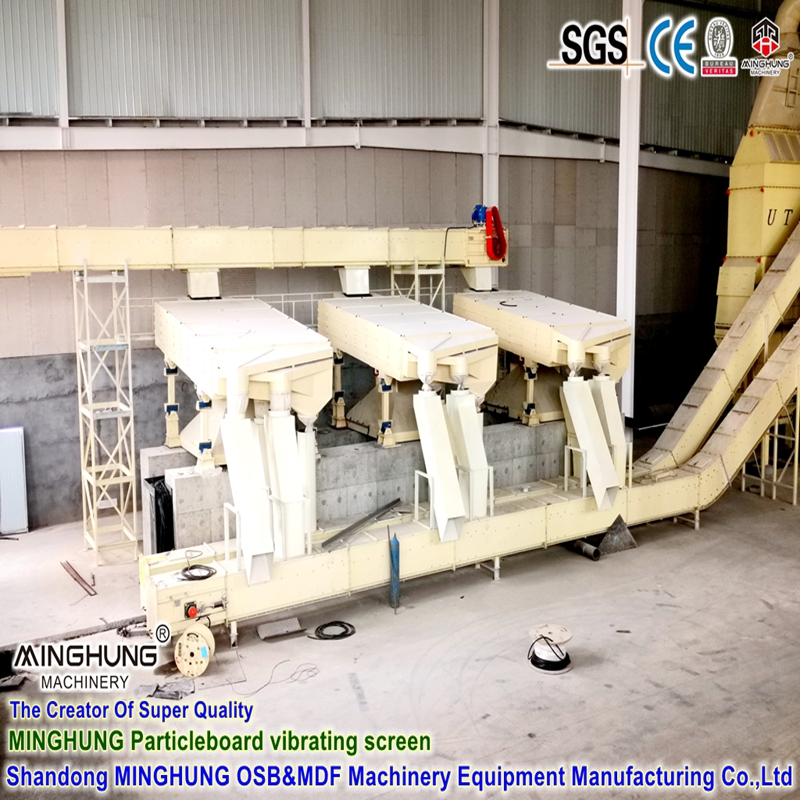 Particle Screening System: An extremely important stage. Multi-deck vibrating screens precisely separate particles into surface and core layer fractions. More precise separation results in a more rational board cross-section structure, higher surface quality, and stronger crack resistance.
